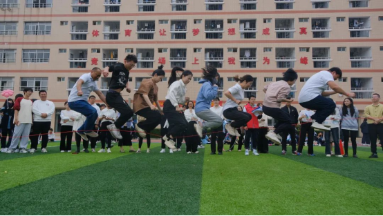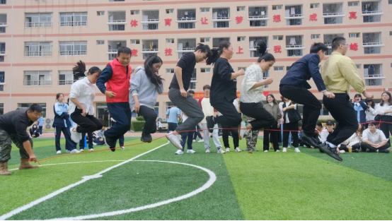 運動場上的較量,不僅是個人力量的角逐,更是團隊合作力量的展現(xiàn)。師生分別派出代表參加團隊趣味賽,在旋風跑、呼啦圈接力,集體跳大繩項目中齊心協(xié)力,做彼此最堅實的后盾和最默契的隊友,互相配合,并肩作戰(zhàn),奮勇爭先。