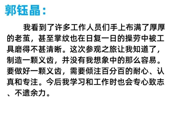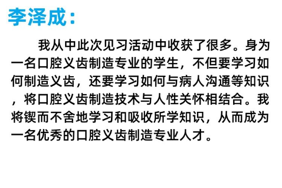 本次活動(dòng)為全體學(xué)生們提供了學(xué)習(xí)與交流的平臺(tái),為學(xué)習(xí)、就業(yè)之路打下堅(jiān)實(shí)的基礎(chǔ),進(jìn)一步加強(qiáng)學(xué)生對(duì)理論知識(shí)與實(shí)踐運(yùn)用的相結(jié)合。學(xué)生們了解了口腔義齒制造行業(yè)的快速發(fā)展,激發(fā)了強(qiáng)烈的探索與求知欲望,堅(jiān)定了自己認(rèn)真學(xué)習(xí)專業(yè)知識(shí)、努力提高專業(yè)技能的信念,同時(shí),對(duì)自己的職業(yè)規(guī)劃和學(xué)習(xí)目標(biāo)有了更為精準(zhǔn)的定位,將更加積極地投身于專業(yè)學(xué)習(xí)和實(shí)踐,為實(shí)現(xiàn)自己的人生目標(biāo)而努力奮斗。