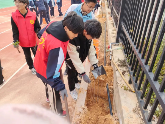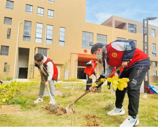 青年志愿,為綠充“植”。師生齊聚,相互協(xié)作,個(gè)個(gè)干勁十足,解袋、扶苗、填土、施肥、澆水,將一棵棵充滿生機(jī)和希望的小樹植入大地,校園呈現(xiàn)出一派熱火朝天的勞動(dòng)景象。