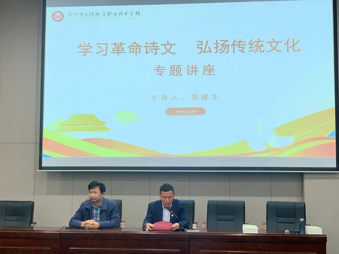 3月22日下午,為貫徹落實(shí)人社部《關(guān)于在全國技工院校開展2023年春季學(xué)期開學(xué)第一課活動的通知》要求,結(jié)合我校首屆校園文化藝術(shù)節(jié)活動安排,我校特別邀請原中共泉州市直交通運(yùn)輸系統(tǒng)黨委郭建生書記為全校近200名師生代表開展了以“學(xué)習(xí)革命詩文 弘揚(yáng)傳統(tǒng)文化”為主題的講座。