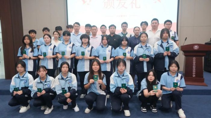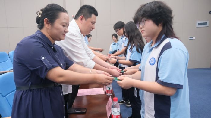 參會的領(lǐng)導、老師為新團員佩戴團徽,頒發(fā)團員證。佩戴上團徽的這一刻,他們成為了共青團的一份子,也肩負起了時代的重任。