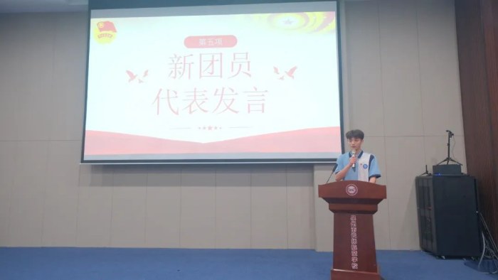 薛育杰同學作為新團員代表發(fā)言,他表示要忠于誓詞,堅定理想信念,刻苦學習、創(chuàng)新實踐,不斷提高自身素質(zhì),并呼吁全體團員們、同學們攜起手來,以嶄新的姿態(tài)面對未來的挑戰(zhàn)。