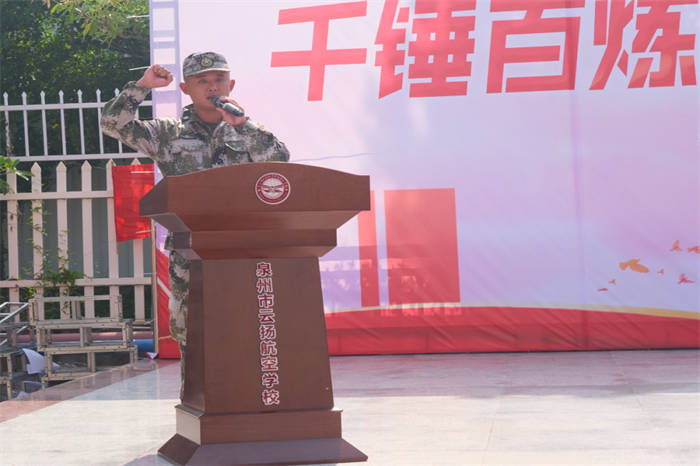 軍訓(xùn)教官代表帶領(lǐng)全體人員進(jìn)行宣誓:服從命令,聽(tīng)從指揮,尊重教官,刻苦訓(xùn)練,遵守紀(jì)律,磨煉意志,不怕困難,爭(zhēng)做訓(xùn)練標(biāo)兵,勇?lián)鷩?guó)防重任,為班級(jí)爭(zhēng)光,為云揚(yáng)添彩!