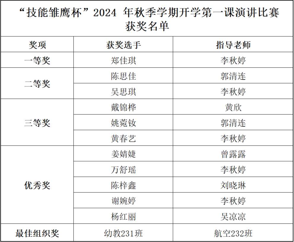 選手們的精彩表現(xiàn)贏得了現(xiàn)場觀眾的陣陣喝彩。評委團(tuán)根據(jù)演講內(nèi)容、語言表達(dá)、形象風(fēng)度等標(biāo)準(zhǔn),進(jìn)行了公正評判。最終,獲獎(jiǎng)名單如下: