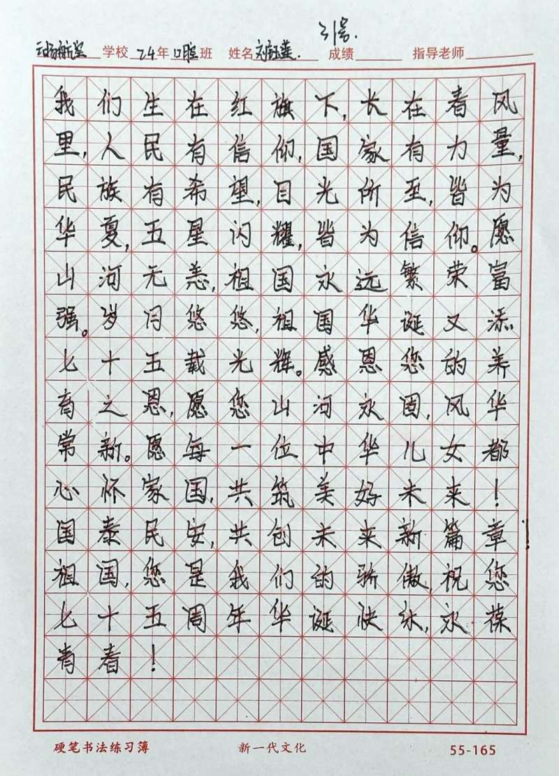 為熱烈慶祝中華人民共和國成立 75 周年,深情贊頌中國共產(chǎn)黨的輝煌成就,培育我校學(xué)生的愛國情感,我校團(tuán)支部舉辦了“七十五載逢盛世,同心共筑譜華章”主題系列活動(dòng)。在此書畫活動(dòng)中,我們共征集到337件作品,我校學(xué)子們以筆墨為紐帶,傳遞對祖國的深厚情感,每一筆每一劃、每一景每一物都傾注了對祖國的熾熱之愛和無盡贊美。經(jīng)過層層篩選,最終評選出22份優(yōu)秀作品,以下為優(yōu)秀作品展示。