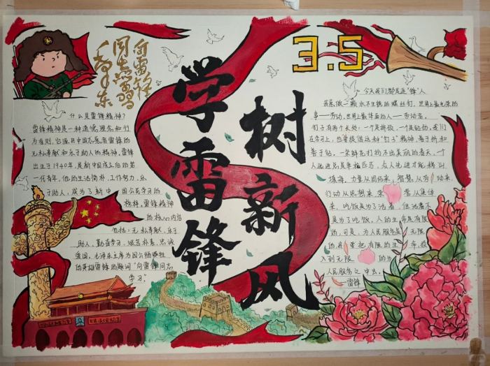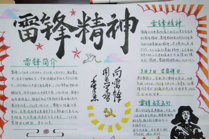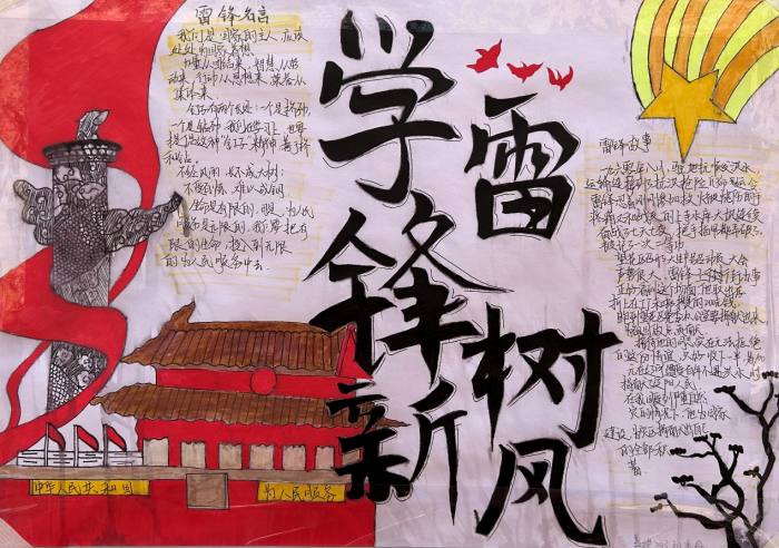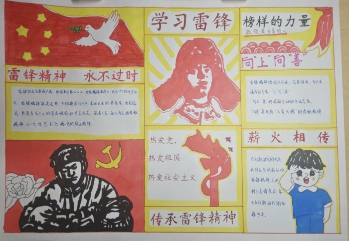 同學們匠心獨運,精心創(chuàng)作了一系列手抄報,生動展現(xiàn)了雷鋒同志的生平事跡、經(jīng)典名言警句以及參與學雷鋒活動的精彩瞬間。這些手抄報內(nèi)容豐富多元,形式活潑多樣,不僅充分展示了同學們在繪畫與書寫方面的才華,更深刻體現(xiàn)了大家對雷鋒精神的崇敬之情與積極傳承的堅定決心。