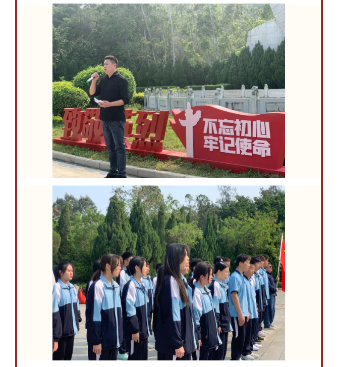 隨后,蔡伯恩老師介紹了惠安烈士陵園的革命歷史,讓同學(xué)們懂得今天的幸福生活是無數(shù)革命先輩拋頭顱灑熱血換來的。他希望同學(xué)們能牢記革命烈士的血淚事跡,發(fā)揚新時代奮斗精神,志存高遠、勤奮踏實!