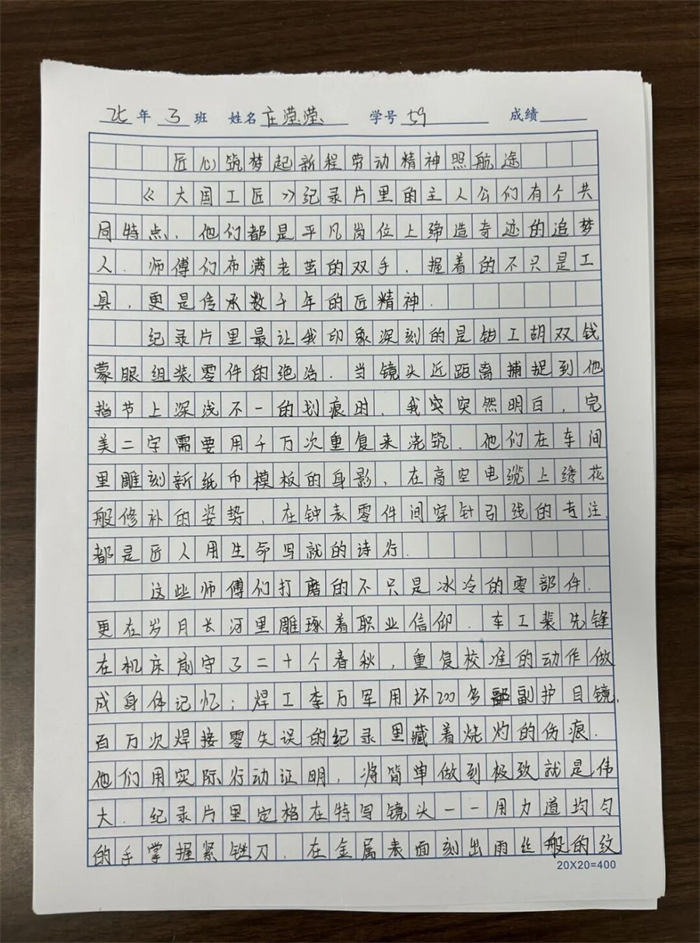 為深化學(xué)習(xí)成效,讓勞模精神真正融入育人全過程,學(xué)校同步啟動(dòng)“勞模精神照我心”主題征文比賽,鼓勵(lì)學(xué)生結(jié)合聆聽感受與自身實(shí)際,暢談對(duì)勞動(dòng)價(jià)值、青春擔(dān)當(dāng)?shù)乃伎?。比賽得到各年?jí)積極響應(yīng),共收到來稿30余篇,同學(xué)們用文字書寫敬意、抒發(fā)志向,紛紛表示要以陳欠水同志為榜樣,刻苦學(xué)習(xí)、服務(wù)社會(huì),讓奮斗成為青春最亮麗的底色。