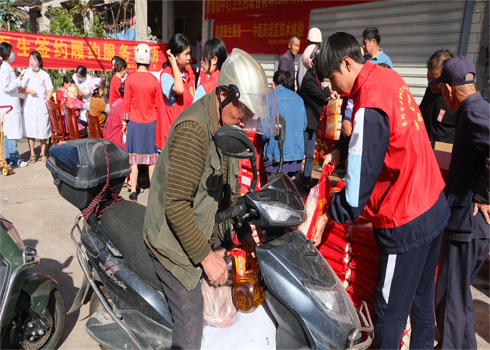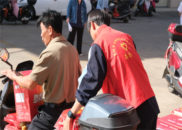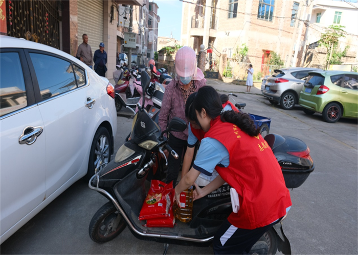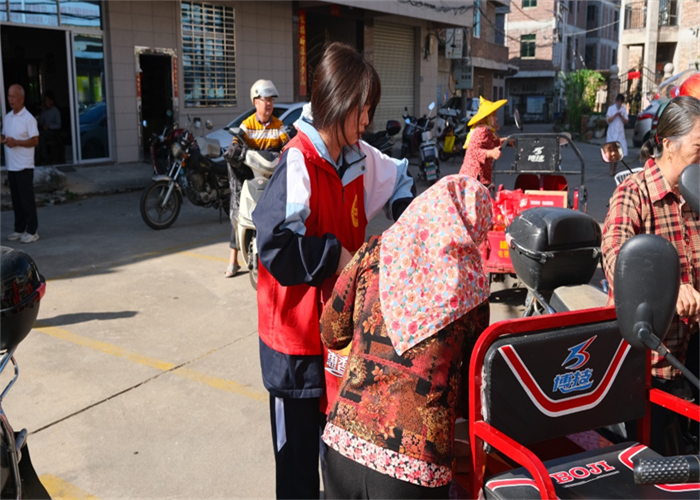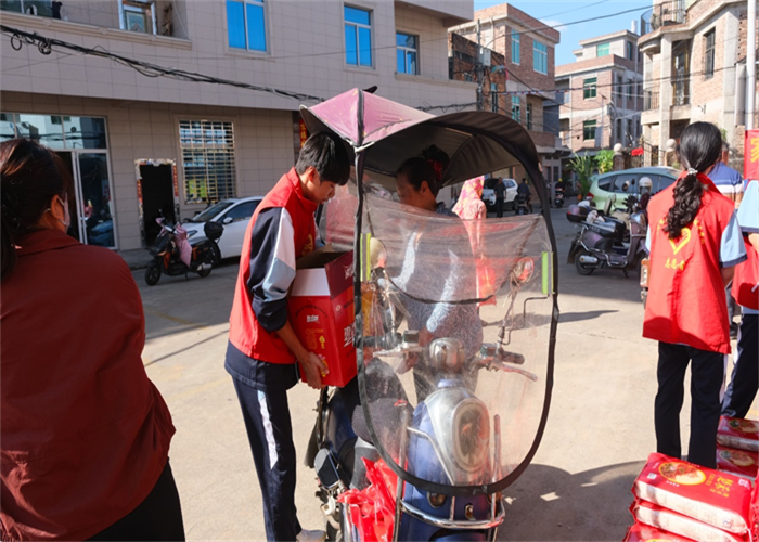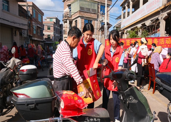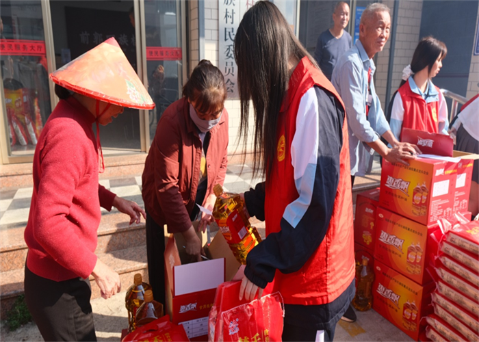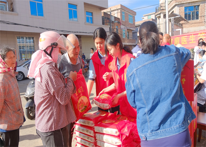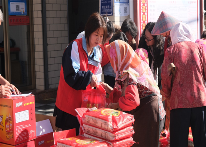 前郭村委會(huì)廣場(chǎng)上早已人聲鼎沸,舞蹈與煙花交織出濃濃的節(jié)日氣氛。人群中,我校志愿者們的身影格外醒目。他們俯身與老人交談,細(xì)心遞上物品,認(rèn)真傾聽(tīng)他們的家常,關(guān)切詢問(wèn)健康狀況與生活起居,將青年一代的敬意與關(guān)懷,化作一句句溫暖問(wèn)候,傳遞到每位老人心中。